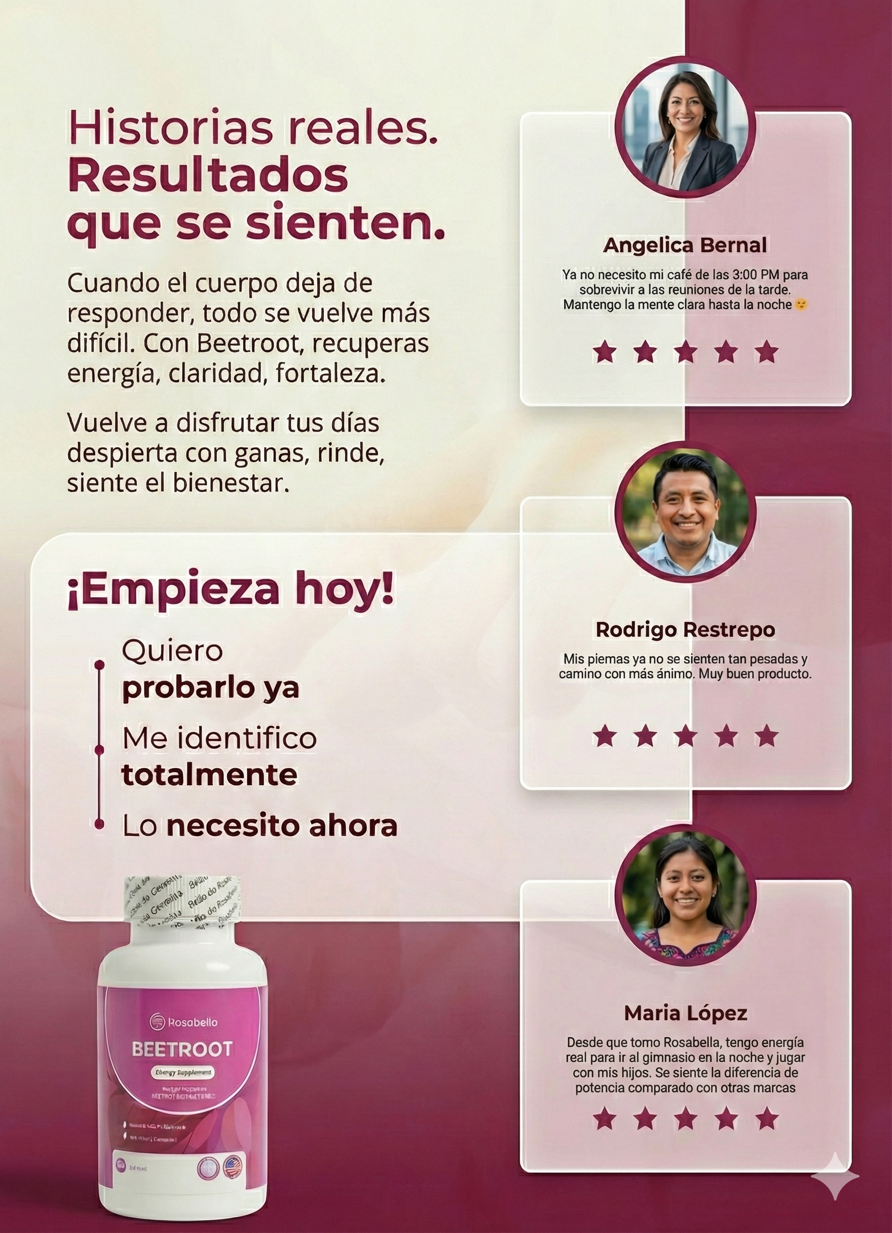 Yo pensé que era otro de esos productos que no sirven, pero no, este sí es bueno. Me ayudó a recuperar mejor después del ejercicio y hasta duermo sin despertar a cada rato. Me encantó.