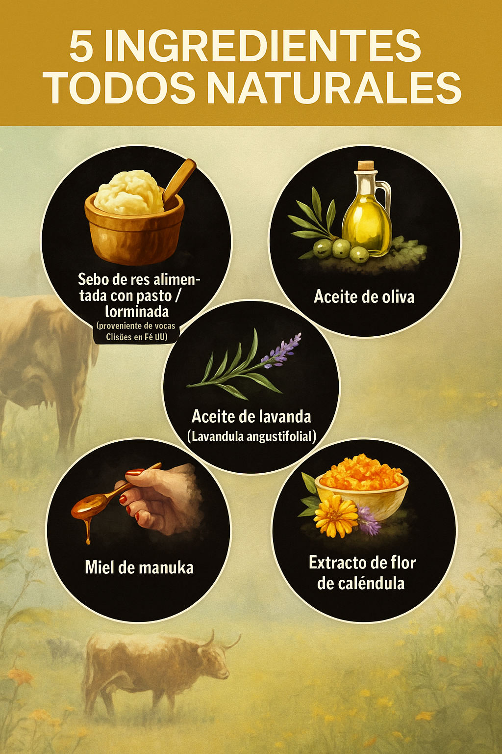Por siglos, nuestros antepasados usaban sebo de res. ¿Por qué? Porque su composición es casi idéntica a la grasa natural de nuestra piel. Por eso la absorbe al tiro, nutriéndola desde adentro sin dejarla pesada ni brillante.